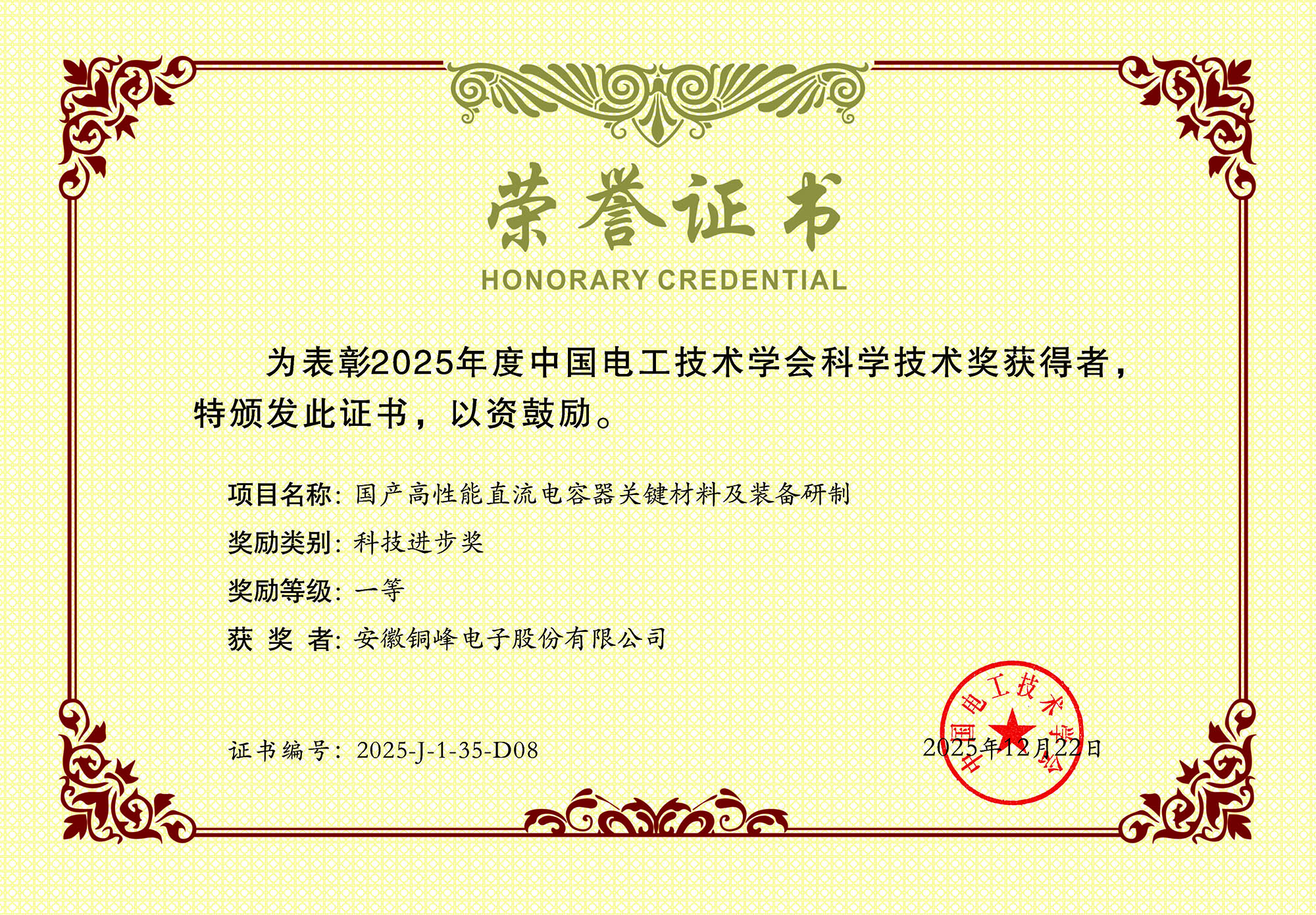 近日,公司參與的合作項目“國產(chǎn)高性能直流電容器關(guān)鍵材料及裝備研制”榮獲2025年度中國電工技術(shù)學(xué)會科技進(jìn)步一等獎。